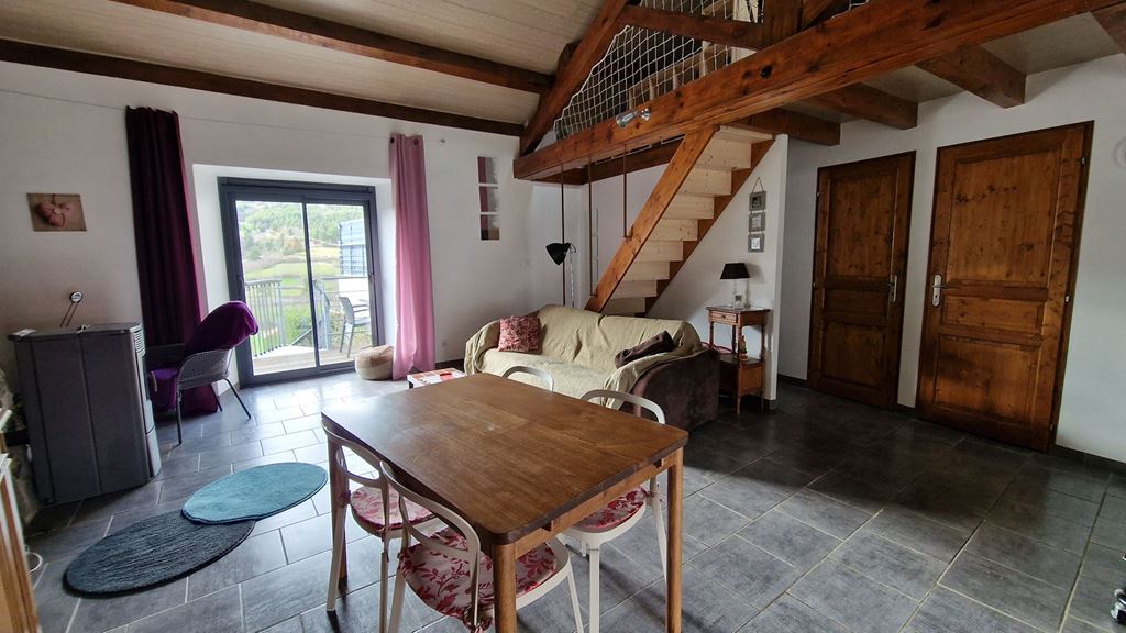 Elle se compose, d’une entrée ouvrant sur une belle pièce de vie lumineuse avec cuisine ouverte et poêle à granulés, donnant accès à une terrasse offrant une vue dégagée.