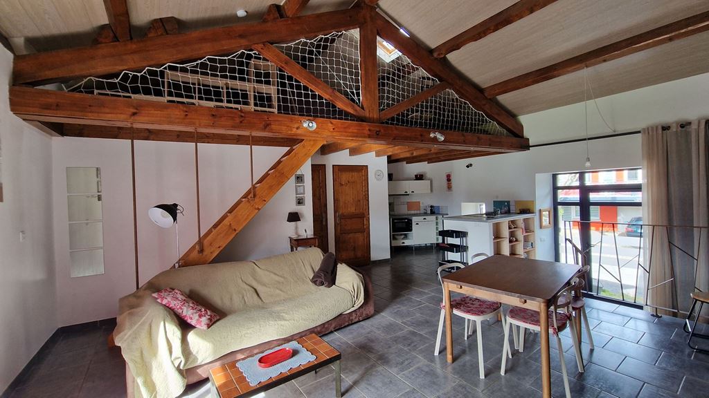 À l’étage, une mezzanine aménagée fait office d’espace nuit.
